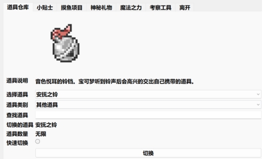 在道具仓库中增加了携带道具,使用方法和正常道具一样,拖到宝可梦身上双击即可,如果希望宝可梦交出道具,可以在其他道具中切换出安抚之铃,对着宝可梦双击后,宝可梦就会交出自己携带的道具了
